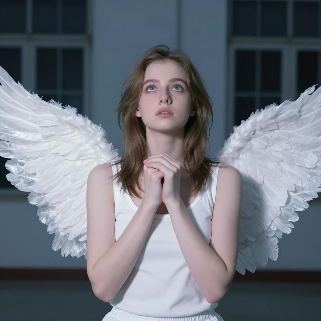 Young woman with light brown hair in white tank top, wearing large white angel wings, clasping hands, looking upwards. Blue-lit industrial background with dark windows. Soft light on left. Intense gaze. Photograph.