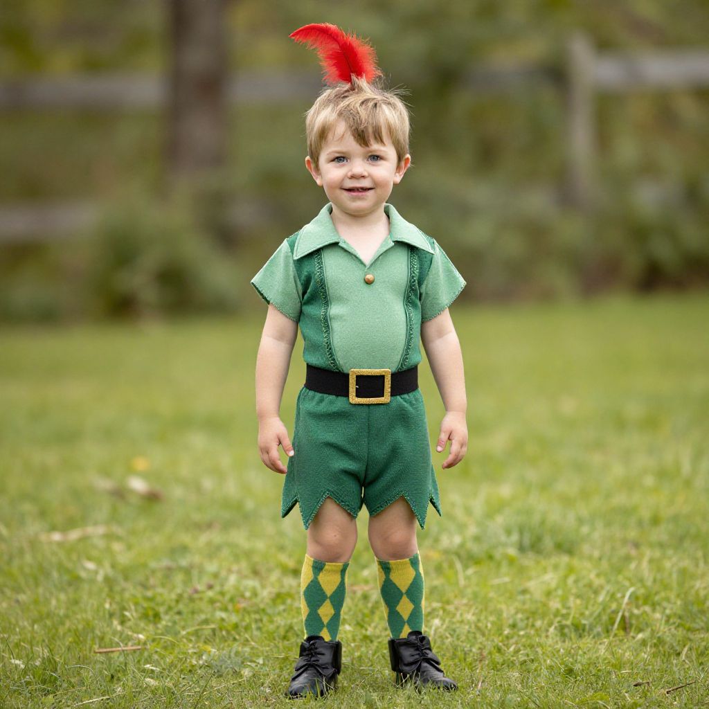 Photograph of a young Caucasian boy standing in a grassy field. He has light brown hair and is smiling. He wears a green, short-sleeved, button-up shirt with a black belt featuring a gold buckle, and green shorts with a jagged hem. His outfit is completed with yellow and green argyle knee-high socks and black shoes. A small red feather adorns his hair. The background is blurred, showing green foliage and a wooden fence. The image has a slightly over-saturated, whimsical style, enhancing the vibrant colors of the boy's costume.