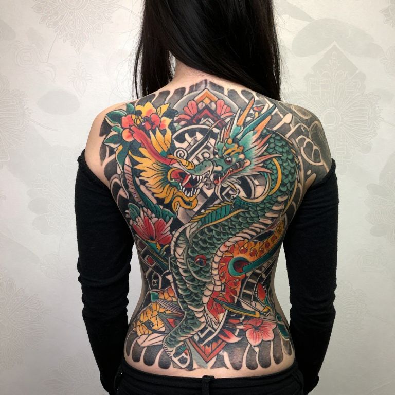 Photograph of a person with long dark hair standing with their back to the camera, showcasing an extensive, intricate full-back tattoo. The tattoo features vibrant, colorful designs including dragons, flowers, and geometric patterns. The person is wearing a black long-sleeve shirt that matches the dark tones of their hair. The background has a patterned wall with light gray and white tones.