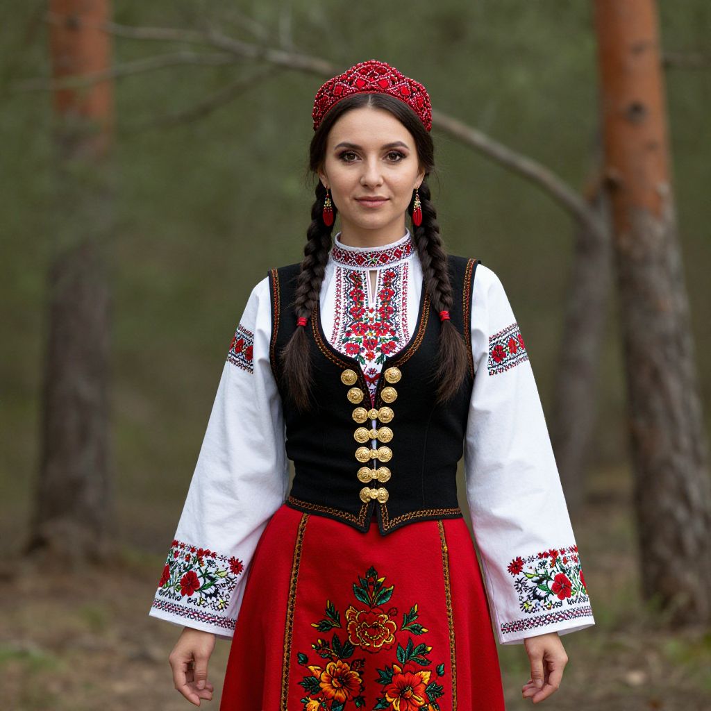 Bulgarian woman wearing vibrant traditional attire, featuring a white blouse with red accents, a black vest adorned with gold buttons, and a red skirt embellished with floral patterns, stands gracefully outdoors in a forested setting, her hair styled in two braids and adorned with a matching red headpiece and earrings.