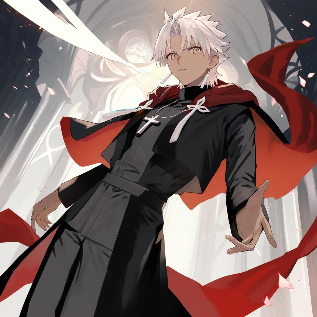 Digital anime-style illustration of Amakusa Shirou from the Fate series. The character is a dark-skinned male with short white hair and yellow eyes, dressed as a priest in black robes with a red cape. He wears a cross necklace and earrings, set against a bright gothic cathedral background with floating petals.