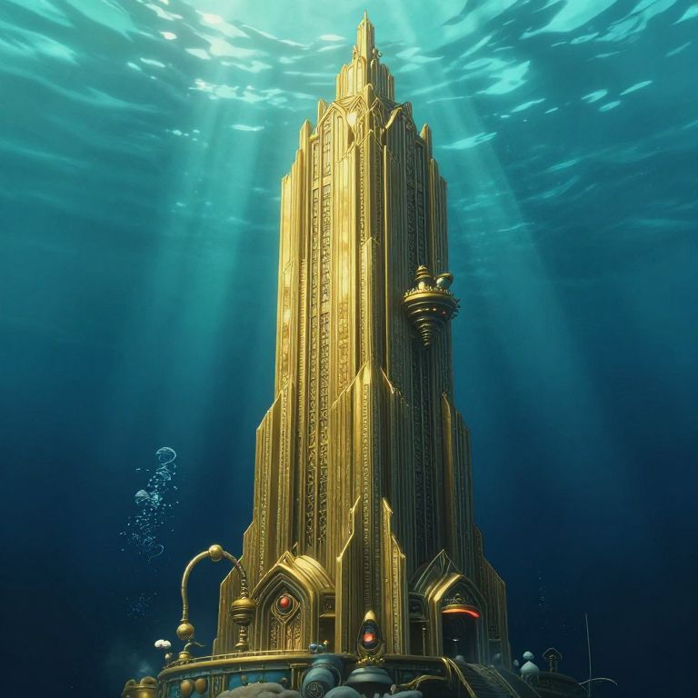 Bristly an art deco golden tower at the bottom of the sea, steam punk, fantasy, concept art, studio ghibli,