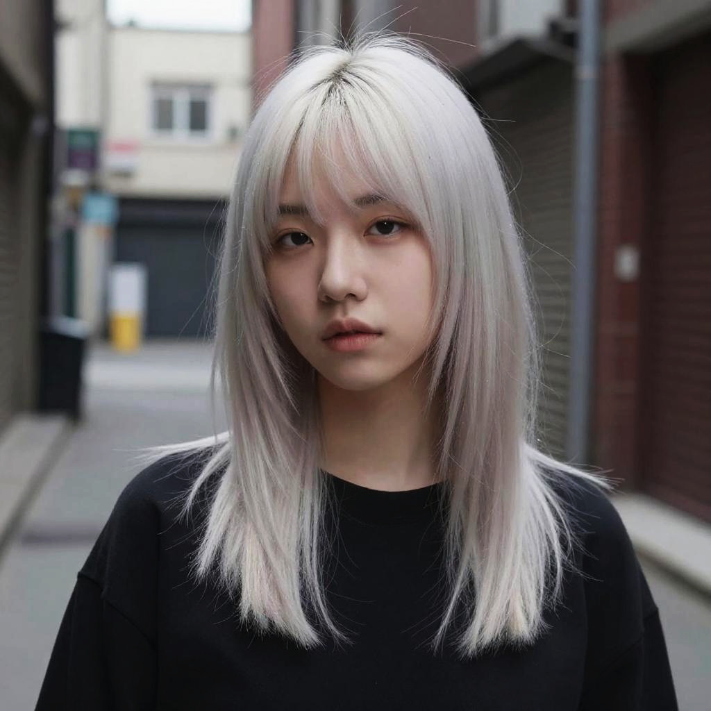 Photograph of a young Asian woman with silver-white hair, wearing a black top, standing in an urban alleyway with blurred buildings.