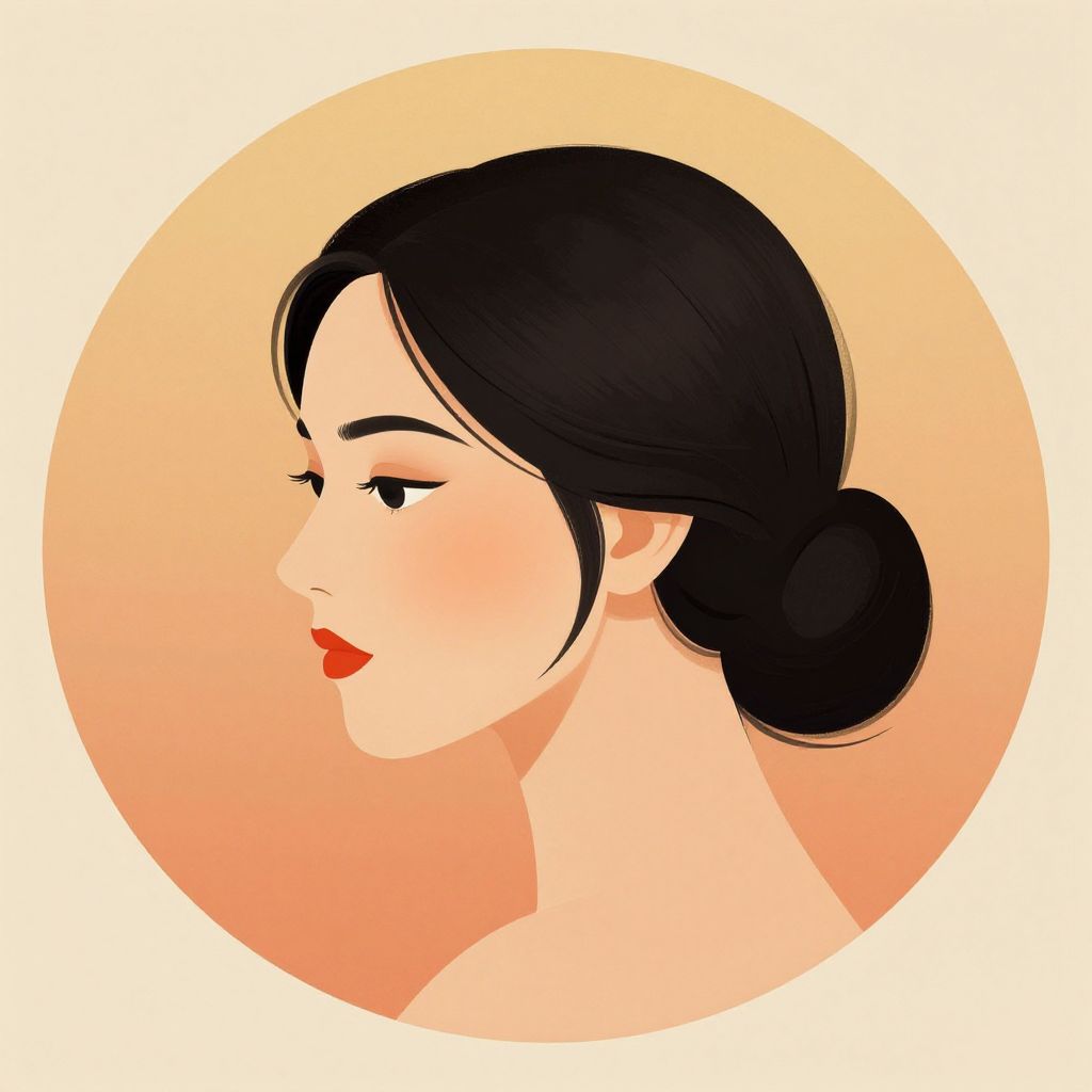 A stylized digital illustration by Hsiao-Ron Cheng featuring a side-profile portrait of a woman with sleek black hair tied in a bun, adorned with subtle blush and red lipstick, set against a warm, circular gradient background that evokes a soft, vintage aesthetic.