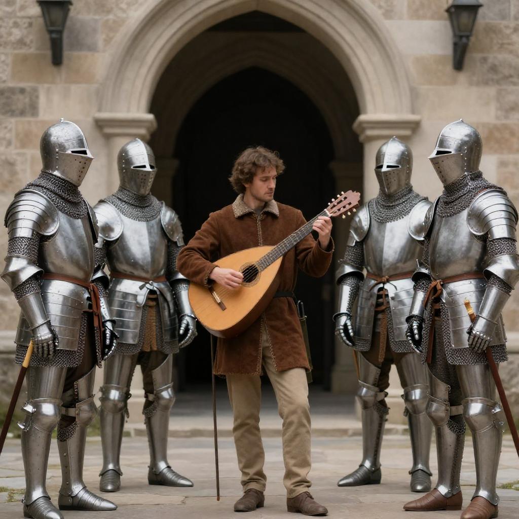 Photograph of a medieval scene: A man with brown hair, wearing a brown jacket and beige pants, stands in the center playing a lute. Four armored knights with silver helmets and chainmail, each with a beige chest plate, stand around him. They are in front of a stone archway with a dark, arched doorway in the background.