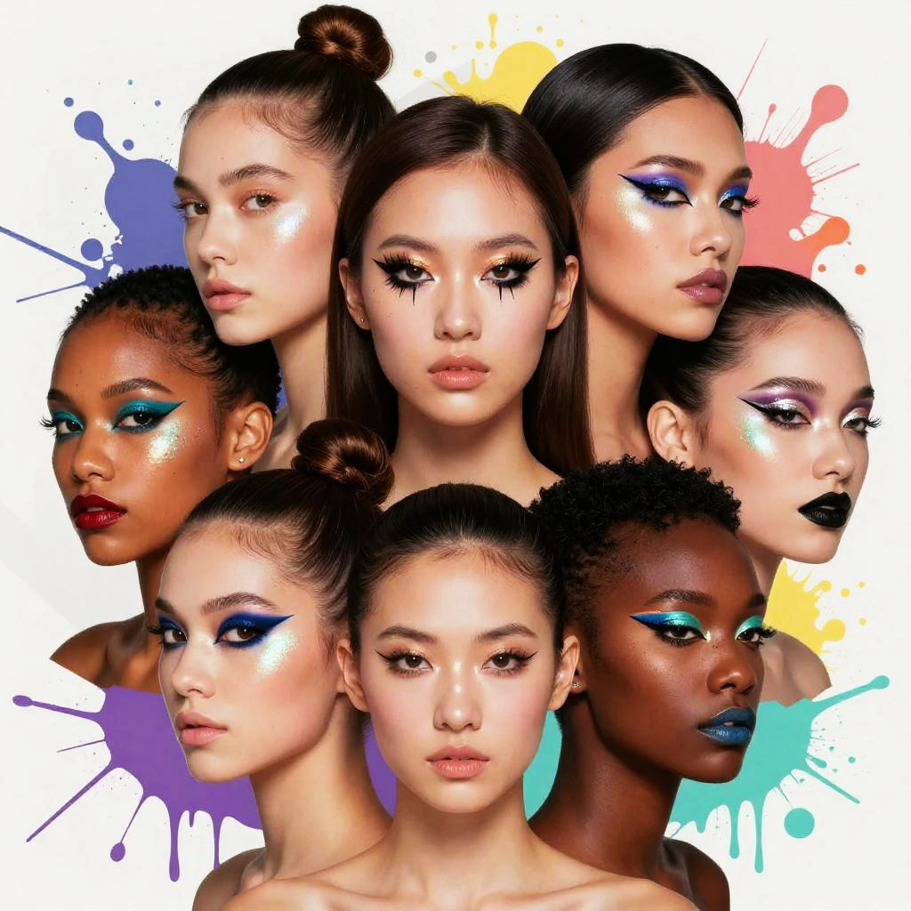 Makeup idea generator artwork, a diverse group of faces showing experimental and bold makeup designs, mixing sharp graphic eyeliner, metallic shades, and luminous highlights, abstract background with paint splatters and digital elements, contemporary art style