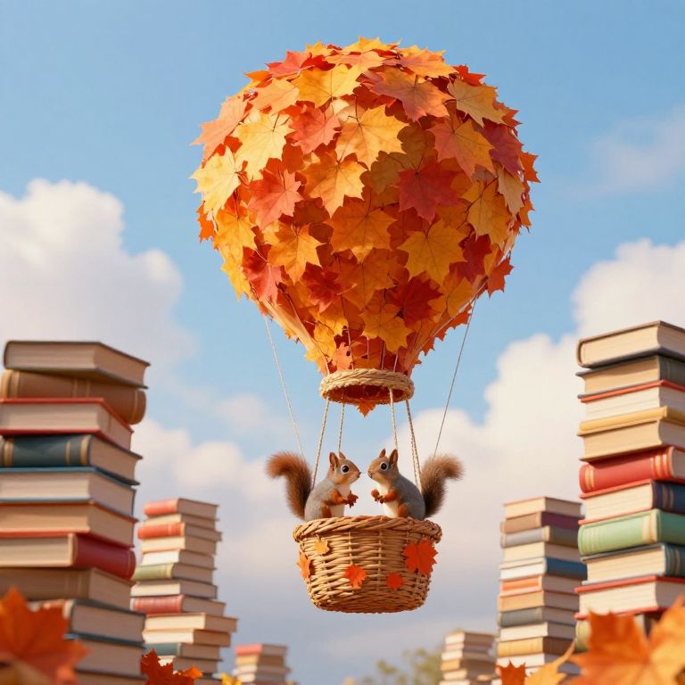 Two adorable squirrels perch inside a woven basket suspended beneath a whimsical hot-air balloon crafted from vibrant orange maple leaves, soaring gracefully between towering stacks of colorful books that float serenely against a backdrop of soft clouds and a clear blue sky.