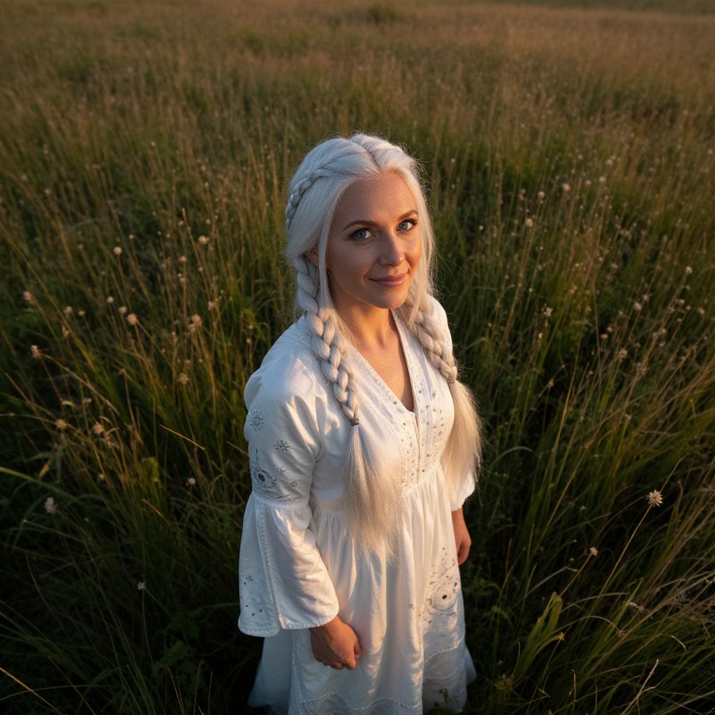 Photograph of a young woman with fair skin and long, platinum-blonde braided hair, standing in a sunlit field of tall, green grass. She wears a white, long-sleeved, embroidered dress with intricate patterns, reflecting the warm, golden sunlight. Her expression is soft, with a slight, gentle smile. The background is a blurred, expansive field, with the sun casting long shadows and creating a warm, late-afternoon glow. The overall mood is serene and ethereal, highlighting her delicate features and the natural beauty of the setting.