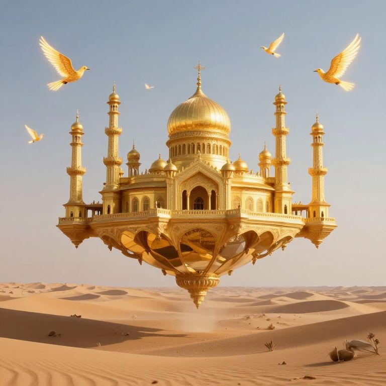 Golden, ornate, floating mosque with four minarets and a central dome, surrounded by golden birds, over a desert landscape. Digital art.