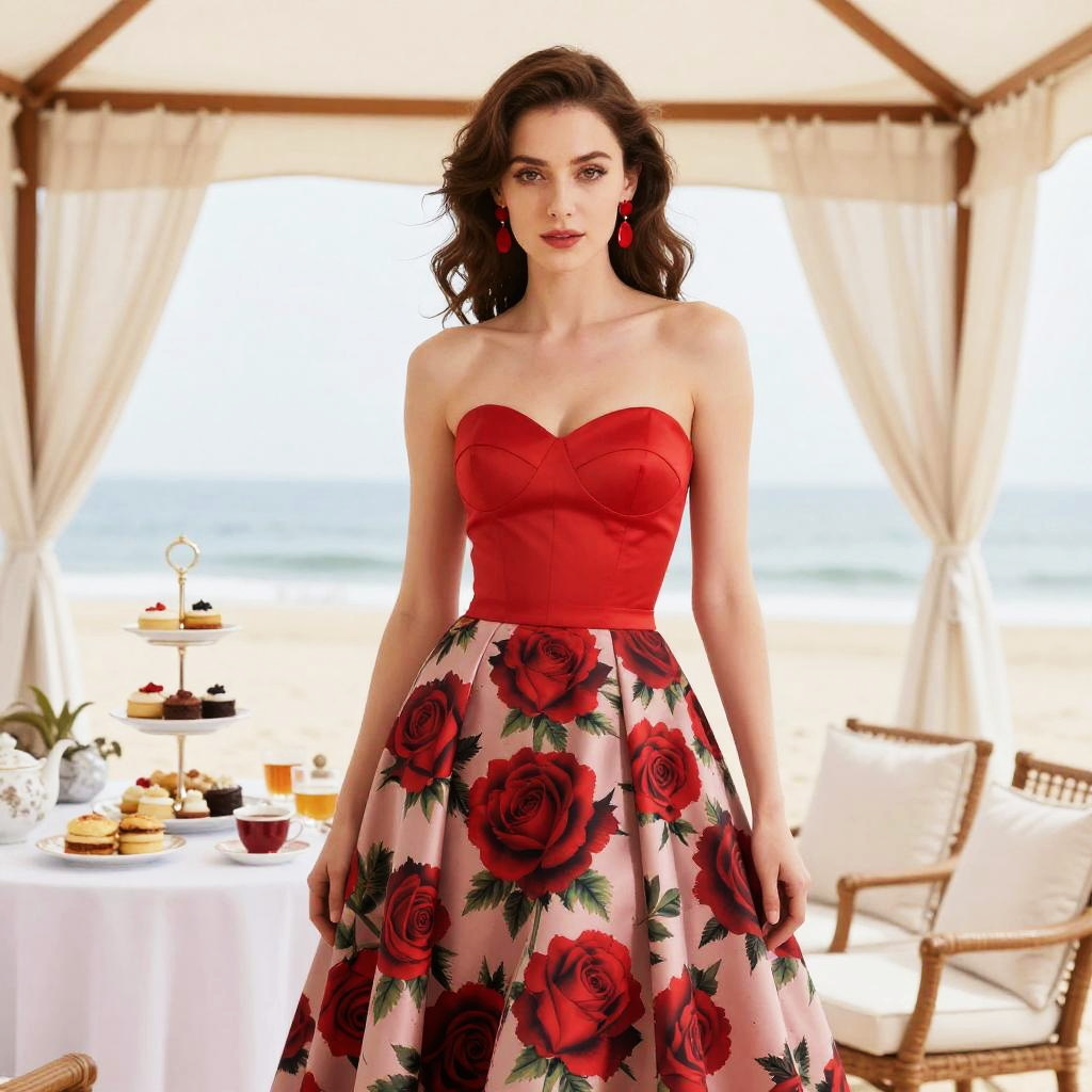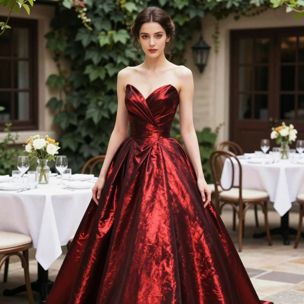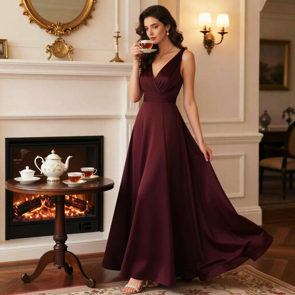 A tall woman in a rich burgundy floor-length gown with a V-neckline and flowing A-line skirt, paired with delicate strappy sandals. Her soft curls cascade down her shoulders as she enjoys refined tea service by a crackling fireplace, embodying timeless elegance. Sexy. Pretty face and beutiful eyes