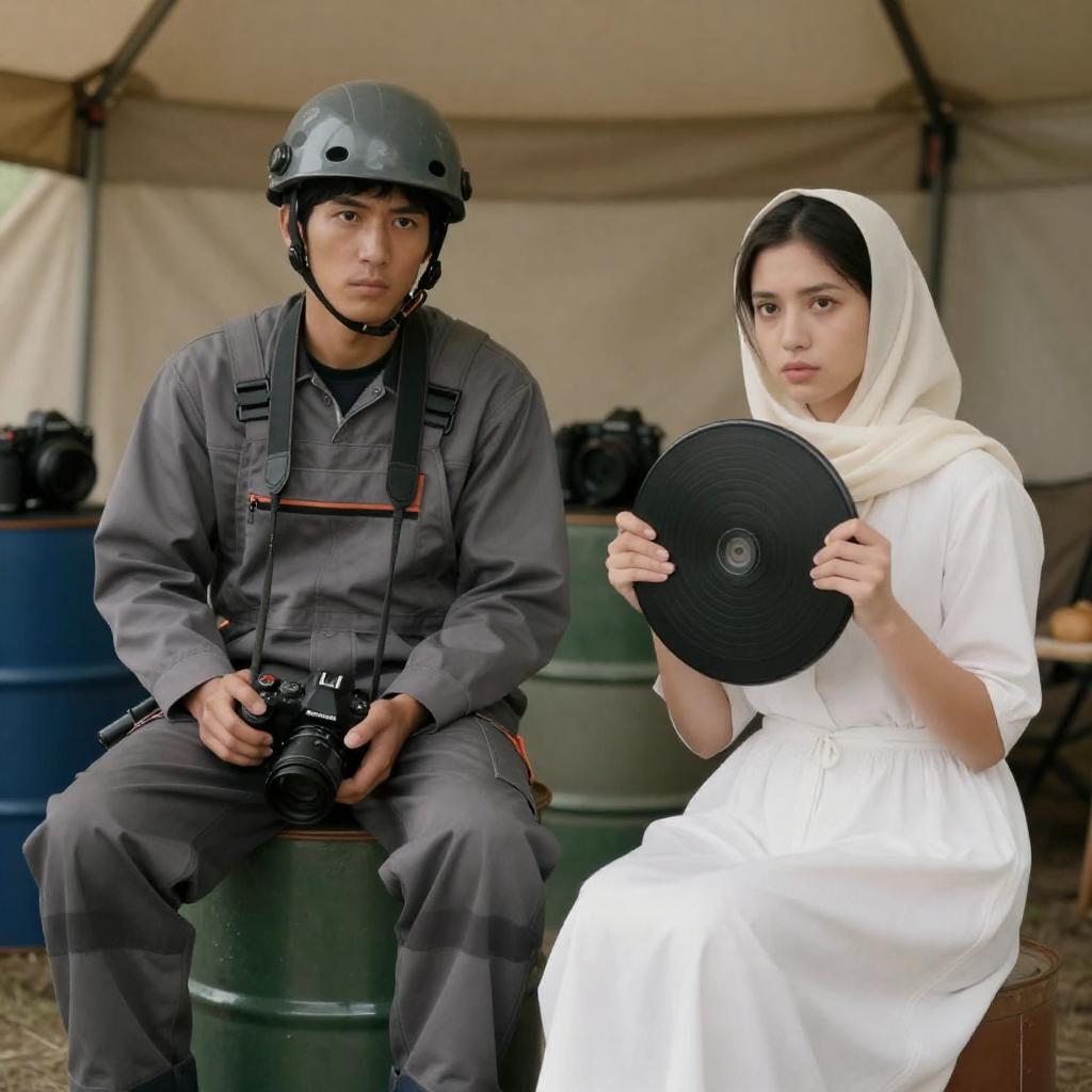 Photograph of two people in a tent. Man in gray coveralls and helmet, holding a camera, sitting on a barrel. Woman in white dress and headscarf, holding a black disk, sitting to his right. Both have intense expressions. Tent fabric background. Camera equipment and barrels behind them. Man on left, woman on right.