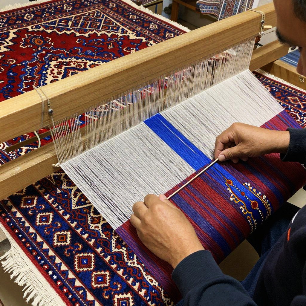 Persa Persian carpet weaving scene, skilled artisan working with vibrant silk threads, intricate patterns, rich reds and blues, traditional workshop with warm lighting, detailed textures, close-up of hands and loom, cultural heritage