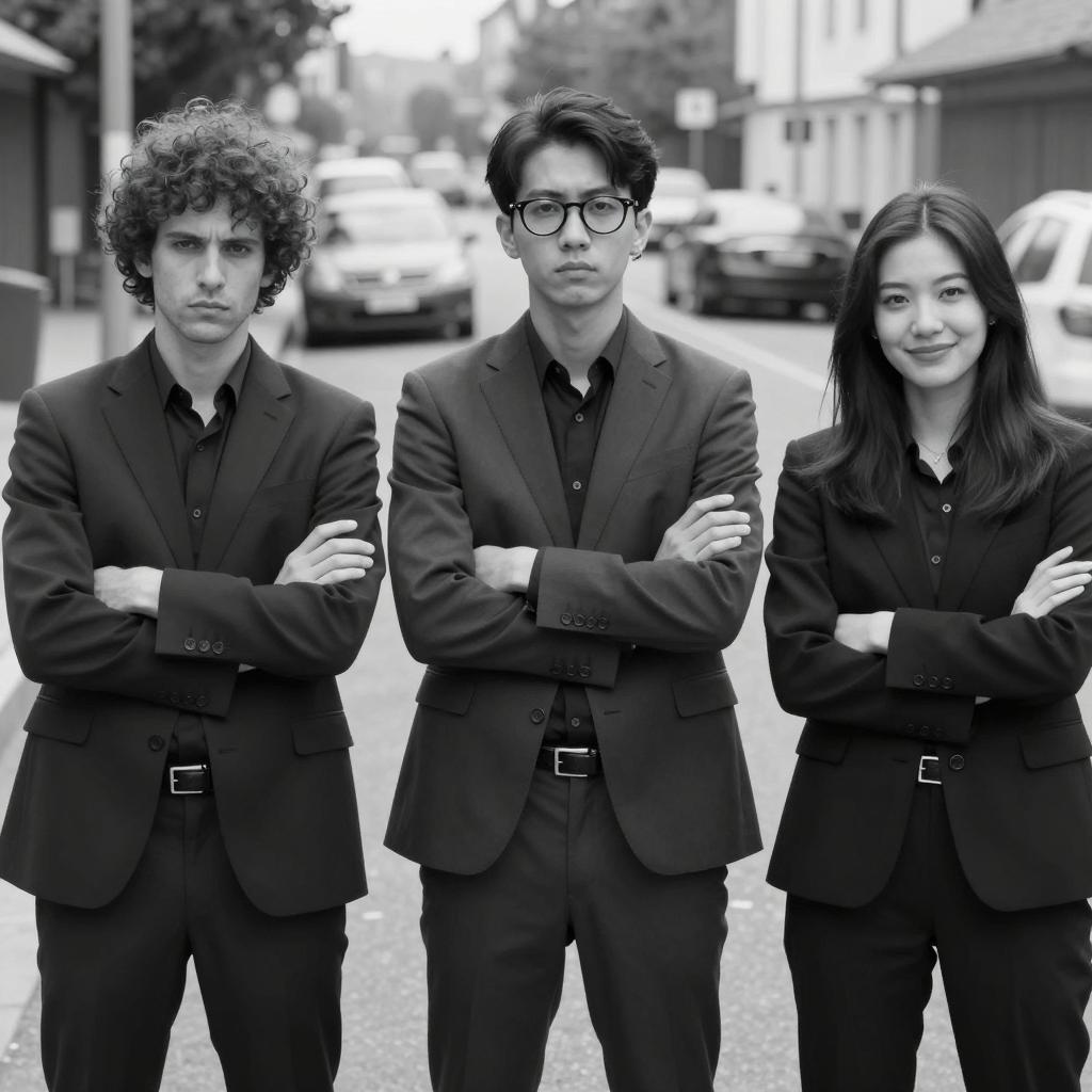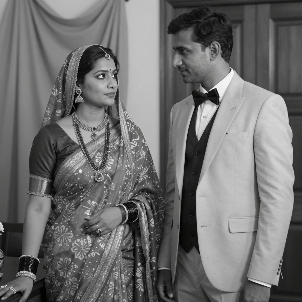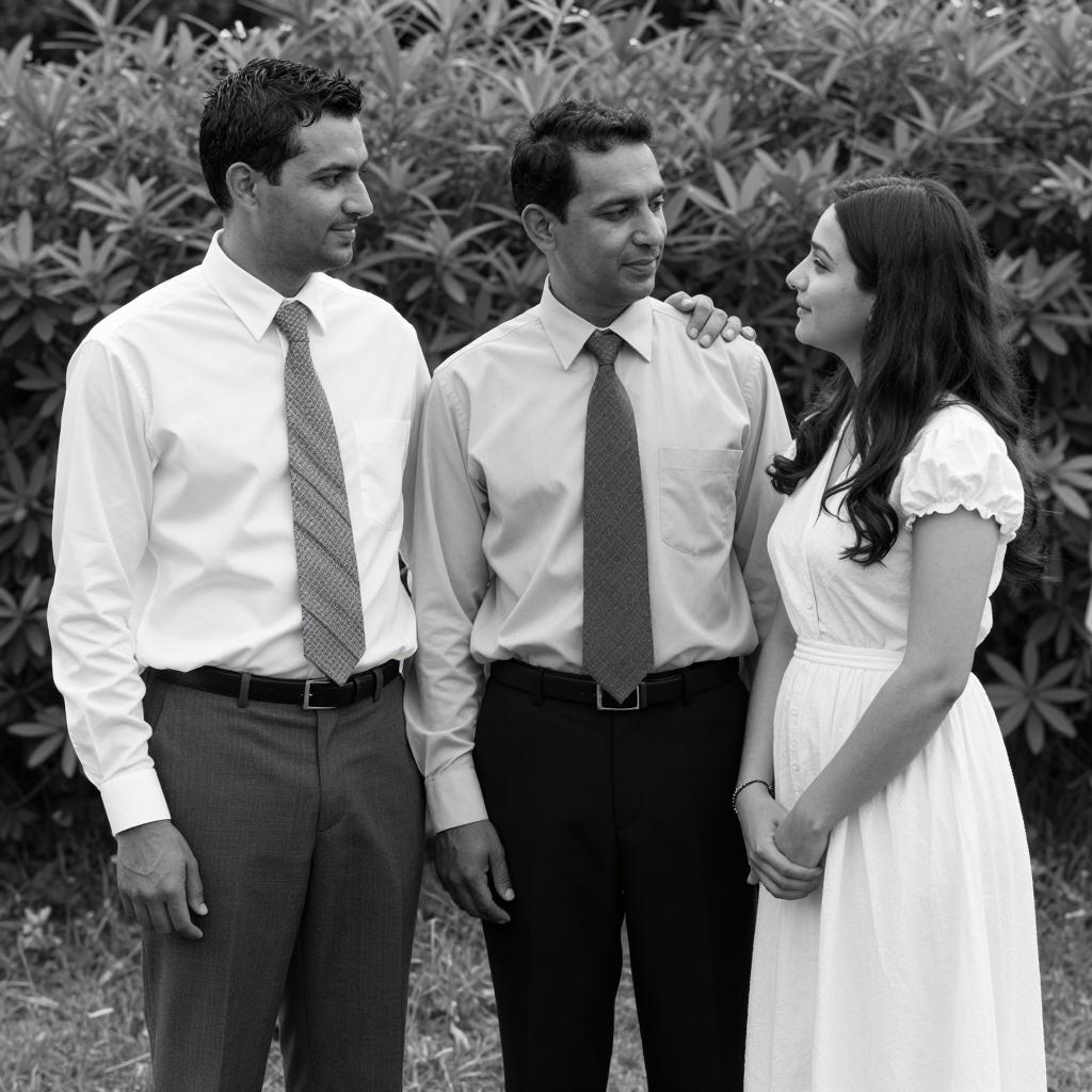 Black and white photograph featuring three South Asian adults standing on grass with bushes in the background. Two men are dressed in formal attire, wearing long-sleeve shirts, ties, and trousers. One man has a checkered tie with a white shirt and grey trousers, and the other wears a light-colored shirt with a solid tie and dark trousers. A woman with long dark hair is wearing a white short-sleeved dress. They appear engaged in a calm and friendly interaction, with one man resting his hand on the other's shoulder and all looking towards one another.