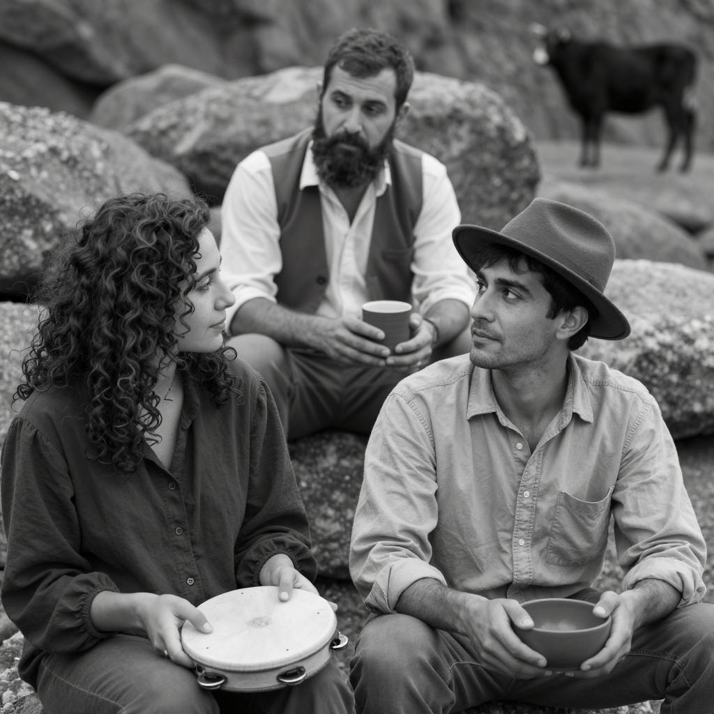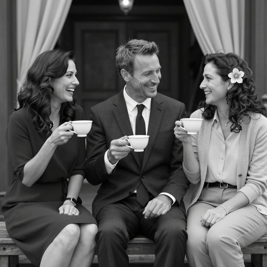 Black-and-white photograph of three people. Two men, one in a checkered tie and white shirt, the other in a light-colored shirt, stand side by side. A woman with long hair in a white dress holds hands with the man in the checkered tie. Bushes in the background. The men look at the woman. The man in the light shirt has a hand on the other man's shoulder. The woman looks at the man in the checkered tie. All three are standing on grass.