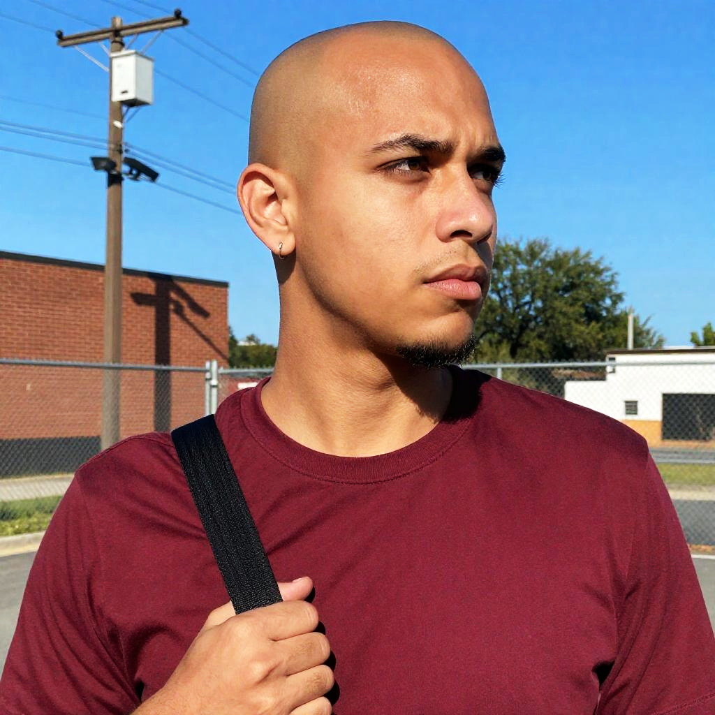 Portrait of a medium-skinned bald man wearing a maroon T-shirt, holding a black strap over his shoulder. He has a small hoop earring in his left ear and a goatee. The background features power lines, a brick building, a chain-link fence, trees, and a clear blue sky on a sunny day.