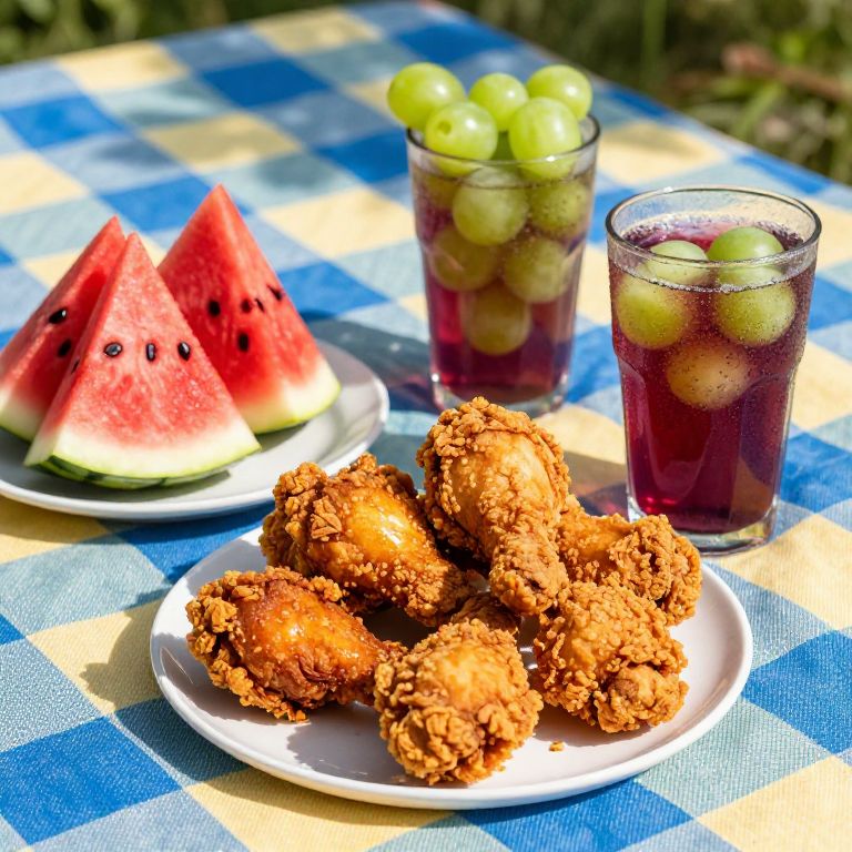 A vibrant still life of fried chicken watermelon and grape kool aid on a colorful picnic tablecloth, dramatic natural lighting highlighting textures, juicy watermelon pieces beside crispy fried chicken, grape kool aid in frosty glasses, relaxed summer day mood