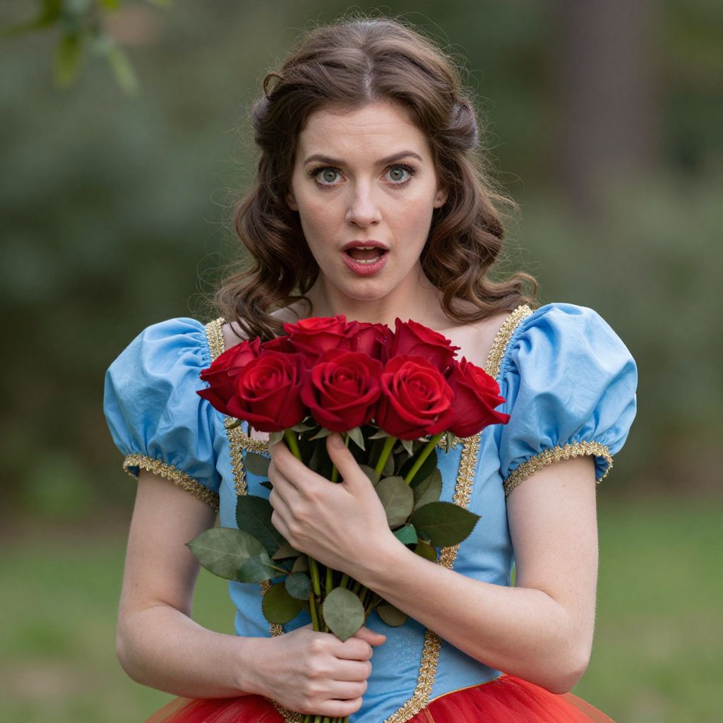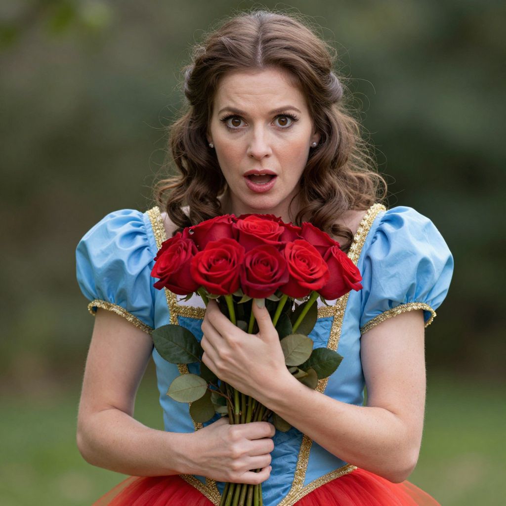 Photograph of a fair-skinned woman with wavy brown hair, wearing a blue dress with gold trim and puffed sleeves, reminiscent of Cinderella. She's holding a bouquet of vibrant red roses close to her chest, with a surprised expression on her face. The background is blurred greenery, suggesting an outdoor garden setting. The dress has a red tulle skirt peeking out.