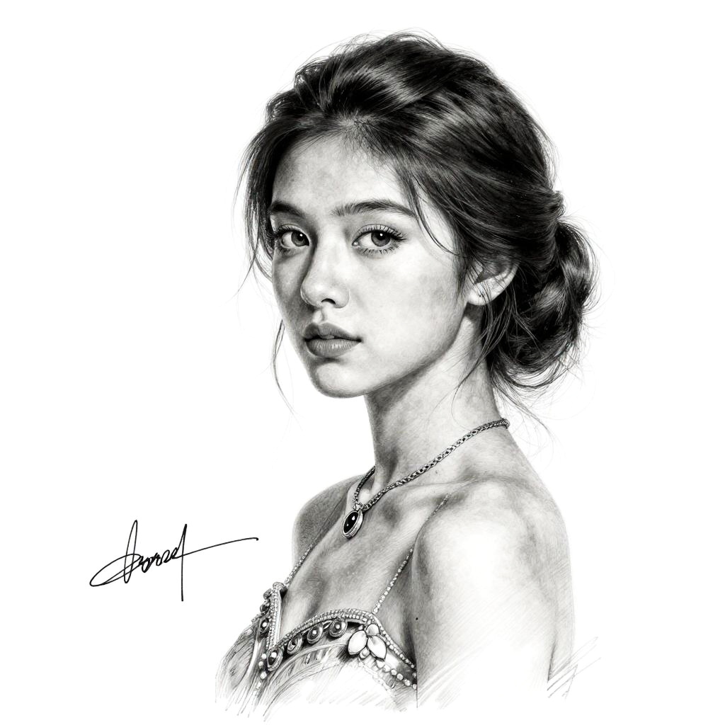 Monochrome, traditional media, signature, greyscale, profile, graphite (medium), realistic, sketch, {{illustration}}, {{{masterpiece}}}, {{best quality}}, {High resolution}, hignity 8k wallpaper, {{intricate detail}}, {highres}, {{{masterpiece}}}}, illustrationfrillsя╝М bestqualityя╝М detailed eyesя╝Мextremely detailed 8k wallpaper, highresя╝Мbeautifulя╝М1girl, highly detailed eyesя╝Мdress, necklace, hair flower, full body shot, high close up, center frame, sharp focus, looking at viewer