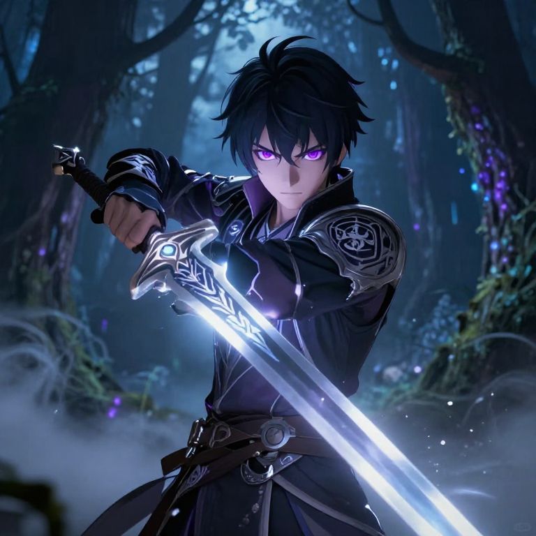 Anime boy with black hair and purple eyes wielding a glowing sword in a dark enchanted forest at night, ethereal light illuminating his determined face, intricate armor with mystical symbols, fog swirling around ancient trees, fantasy epic scene.