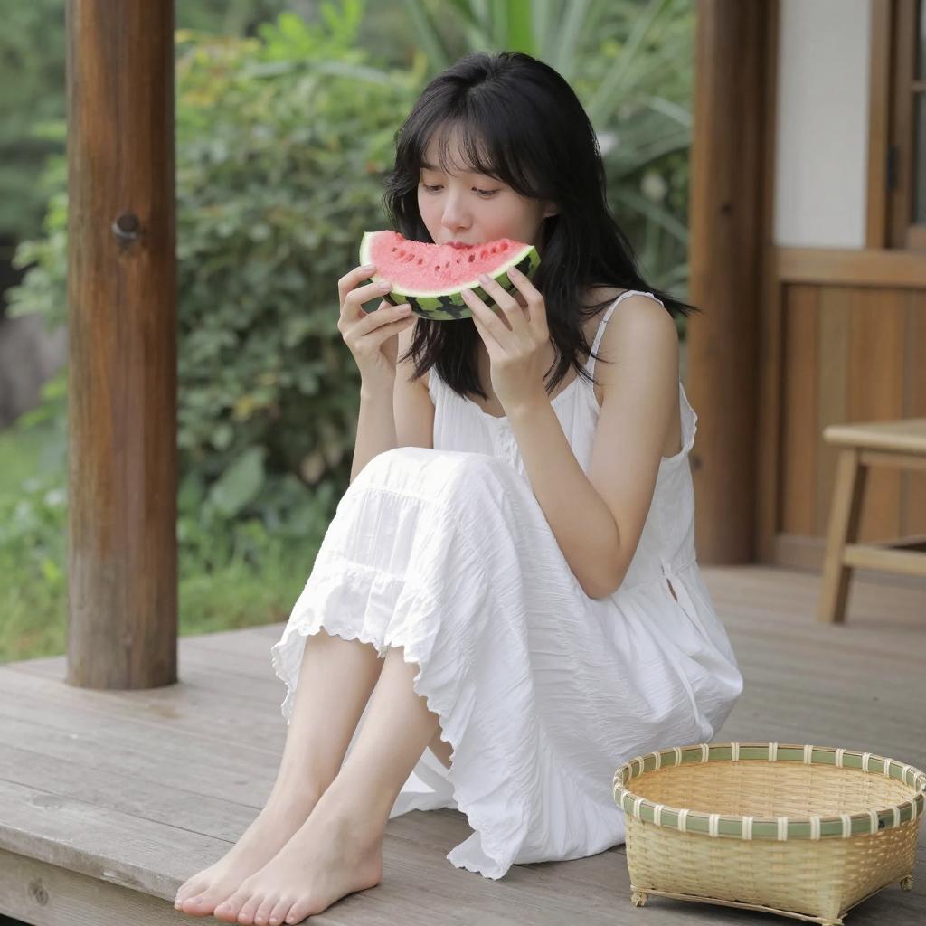 Asian woman with black hair in white dress sits on wooden porch, eating watermelon slice. Holding watermelon with both hands, face partially obscured. Bamboo basket on wooden floor to her right. Green trees and wooden pillars in background. She is barefoot, legs crossed. Bright sunlight, daytime setting. She is alone. Natural light, outdoor setting.