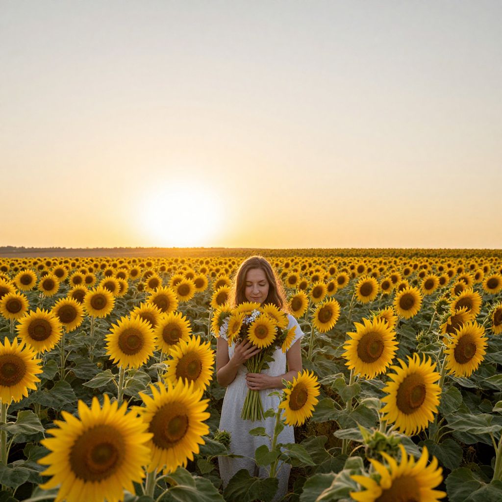 A woman stands amidst a vast field of vibrant sunflowers, her hands gently cradling a bouquet as the golden sunset casts a warm glow over the horizon, creating a serene and timeless scene of nature's beauty.