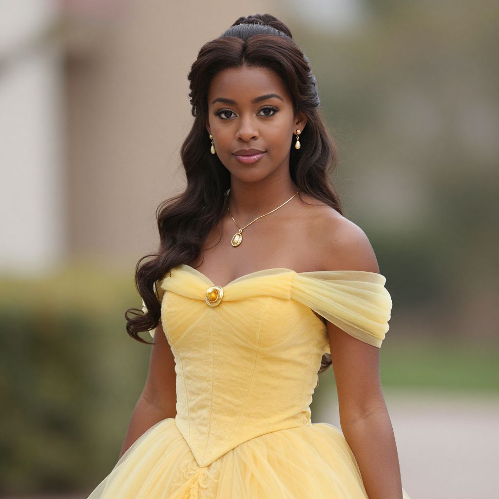 Disney princess belle yellow, 1girl, dress, solo, yellow dress, dark skin, long hair, off shoulder, looking at viewer, dark-skinned female, bare shoulders, blurry background, off-shoulder dress, blurry, brown hair, brown eyes, outdoors, jewelry