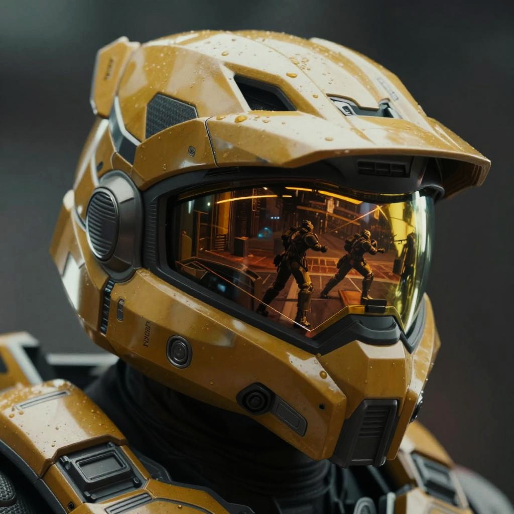 Close-up of Noble 6 Halo Infinite helmet, reflective visor displaying battle scene, intricate armor details, moody sci-fi atmosphere, sharp focus, vibrant color palette