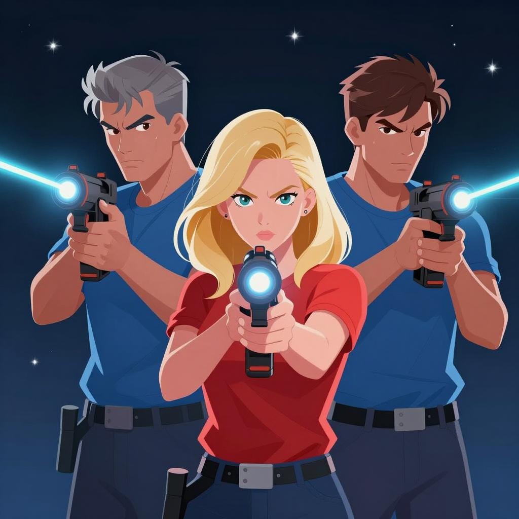 Digital illustration of three people with intense expressions, pointing laser guns forward. Center woman with blonde hair, red shirt; left man with gray hair, blue shirt; right man with brown hair, blue shirt. Bright laser beams from guns. Dark blue starry background. All three in front, slightly overlapping.