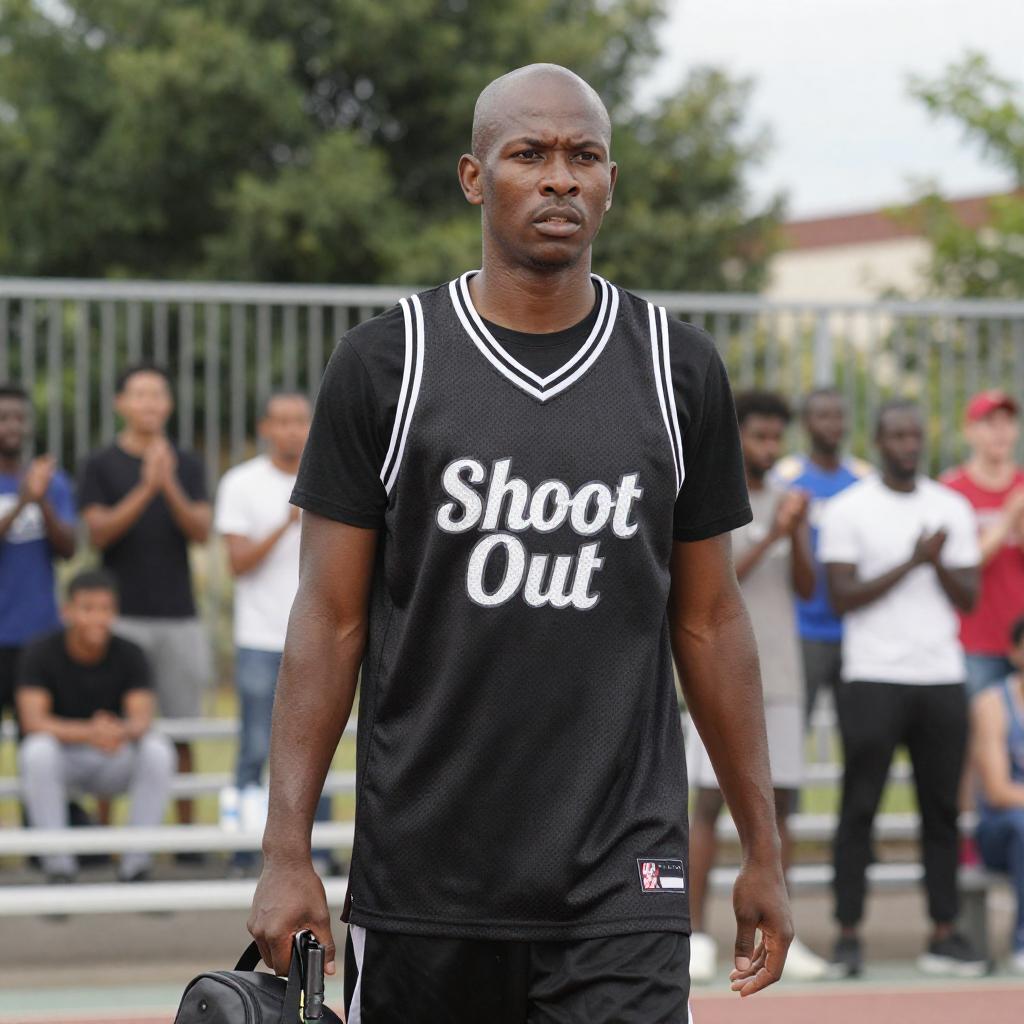 Photograph of a muscular Black man with short, cropped hair, wearing a blue basketball jersey with white trim. He has a focused, intense expression, looking to the side. Blurred background includes greenery and indistinct figures. Sunlight highlights his skin. Upper body shot.