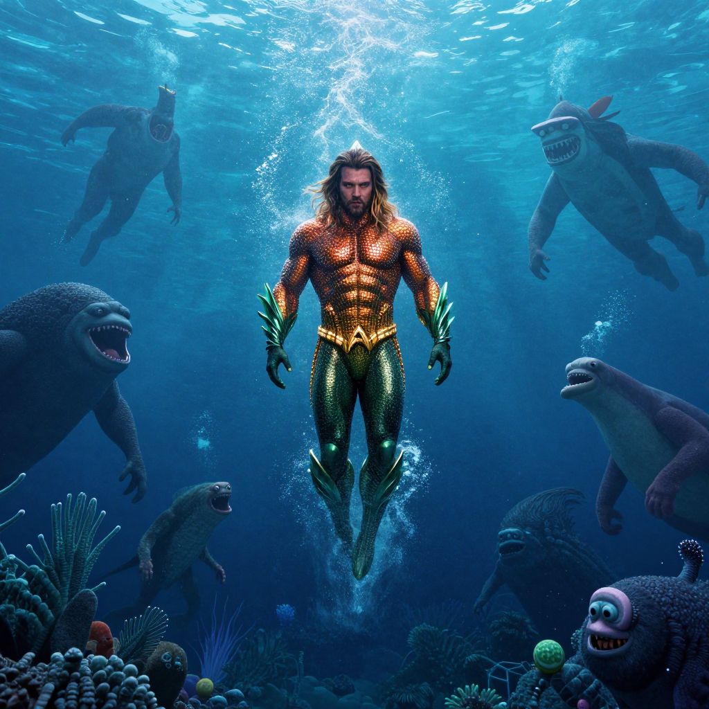 Cameo movie poster style, Aquaman swimming straight downwards into the deep ocean, with all monster underwater creatures chasing him,