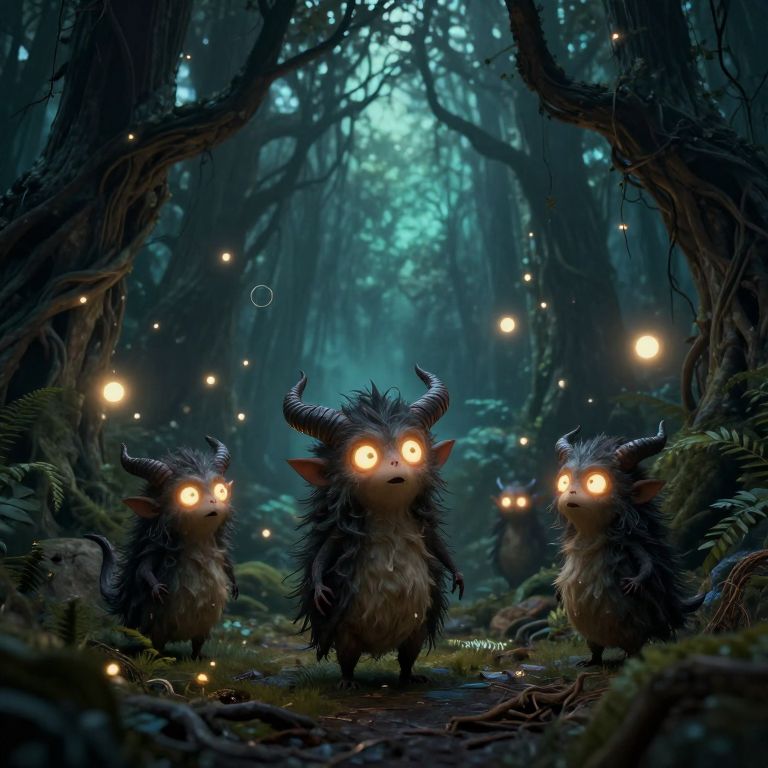 Imps in a dark enchanted forest, mischievous small creatures with glowing eyes and tiny horns, playful expressions, surrounded by magical floating lights, twisted trees and shadowy roots, fantasy art style, rich details, moody lighting