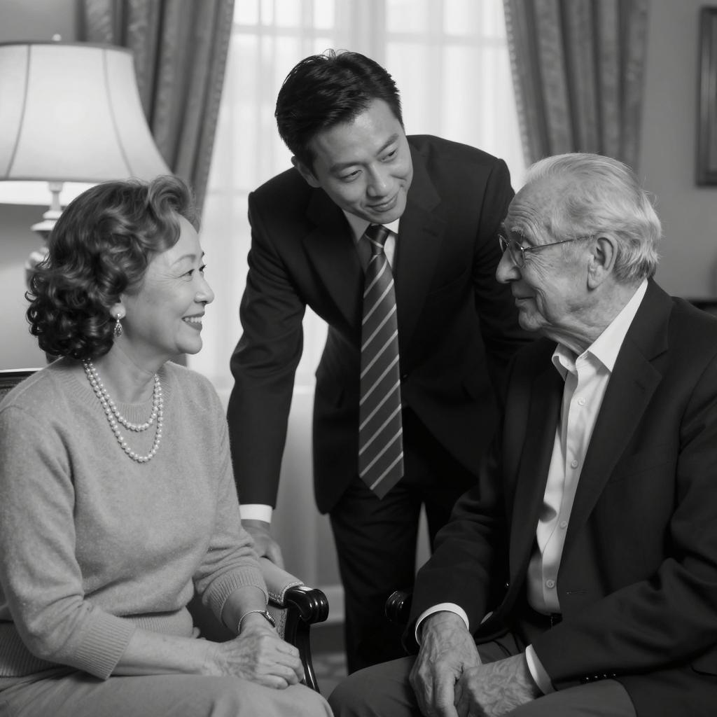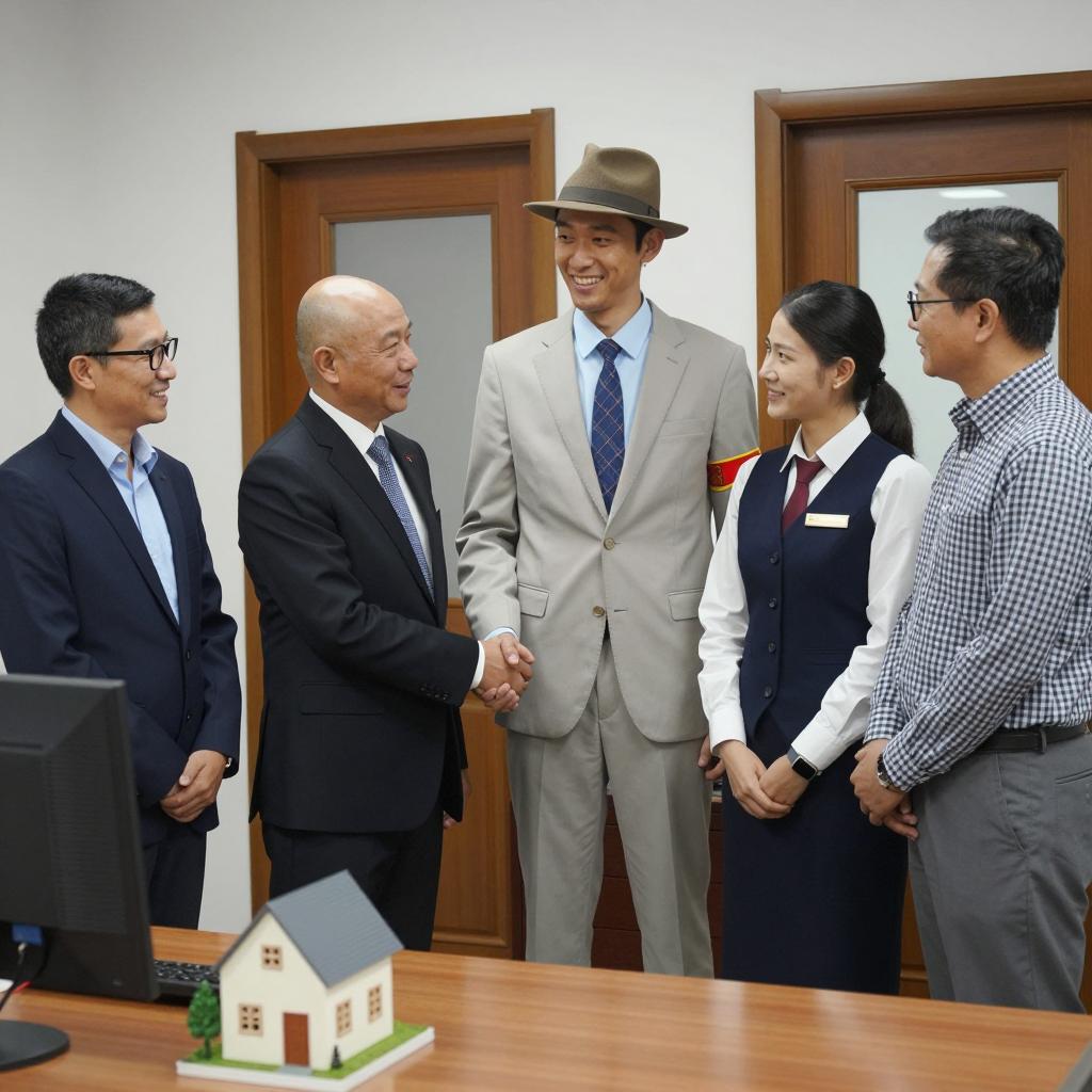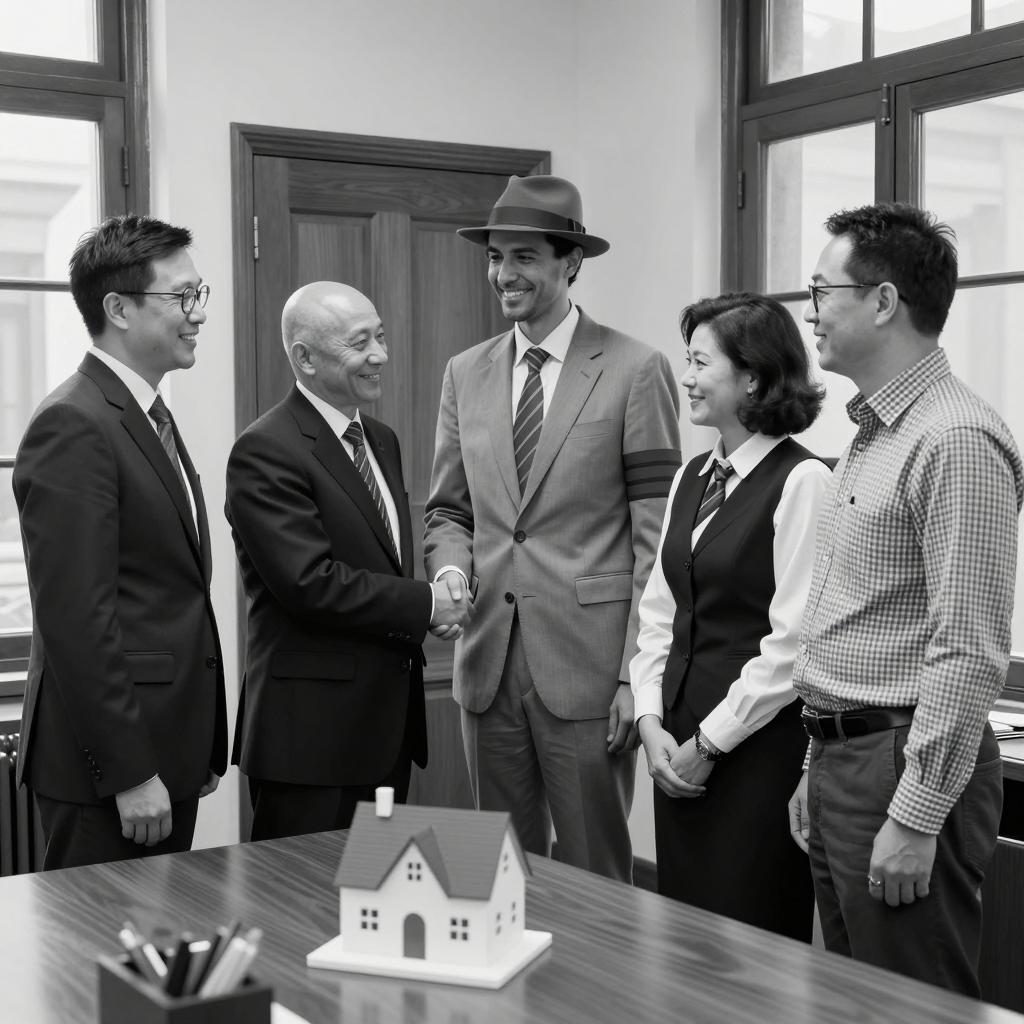 Black and white photograph of five diverse professionals standing in an office. Two men in suits are shaking hands in the center, one wearing a fedora and light suit, the other bald and in a dark suit. Surrounding them are three colleagues, including a woman in a black vest and tie, and two men wearing glasses, one in a dark suit and the other in a checkered shirt. A small house model is placed on a wooden desk in the foreground. The setting features wooden doors and large windows, suggesting a formal business environment.