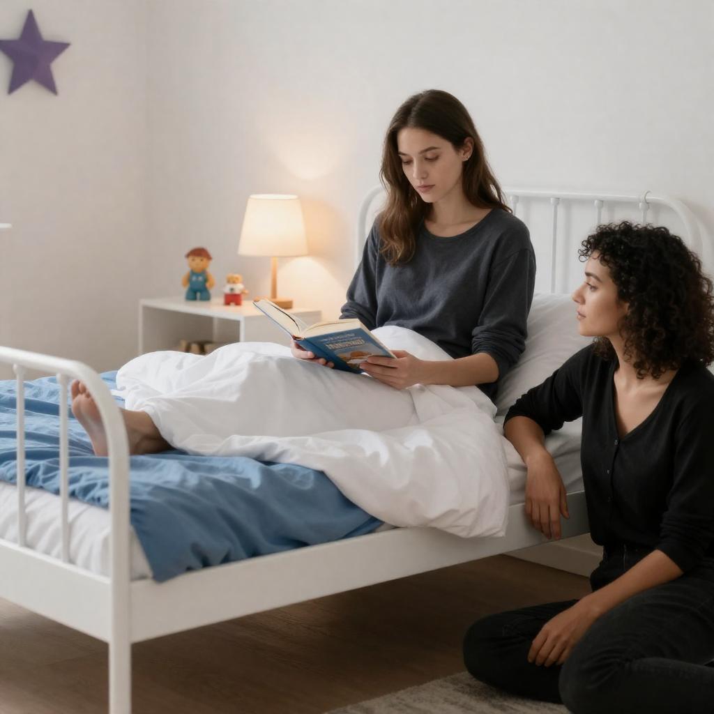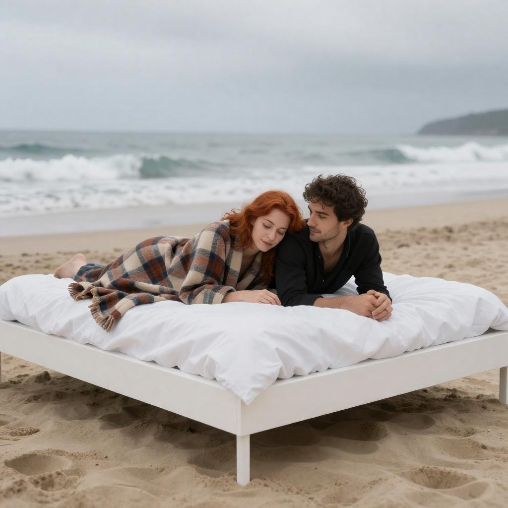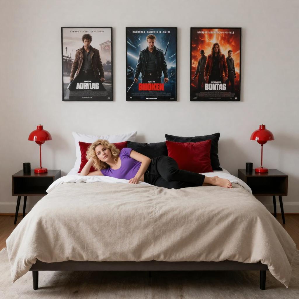 Photograph of a modern bedroom with a large, low bed covered in a beige blanket. A blonde woman with curly hair, wearing a purple top and black pants, lies on the bed surrounded by red and black pillows. Two red lamps sit on either side of the bed, and three movie posters are displayed on the wall above the bed.