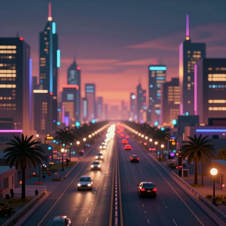 Digital artwork of a neon-lit, futuristic cityscape at sunset, with glowing skyscrapers, busy multi-lane road, and palm trees lining
