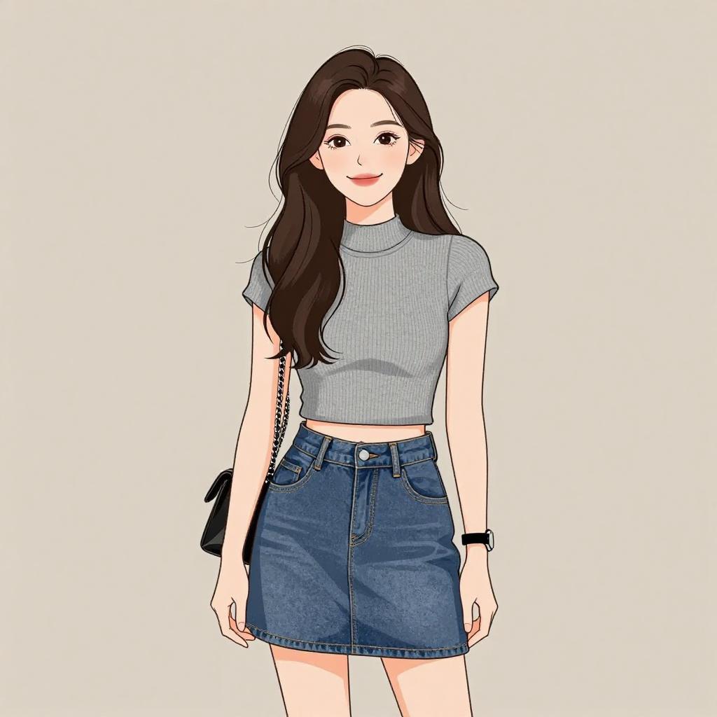 Woman with pretty face and pretty hair. smiling Woman, casual chic, ribbed grey crop top with short sleeves, high neck, denim A-line mini skirt with front button fastening, black shoulder bag with chain strap, minimalistic black wristwatch, natural makeup look, long wavy hair. --sref 1467