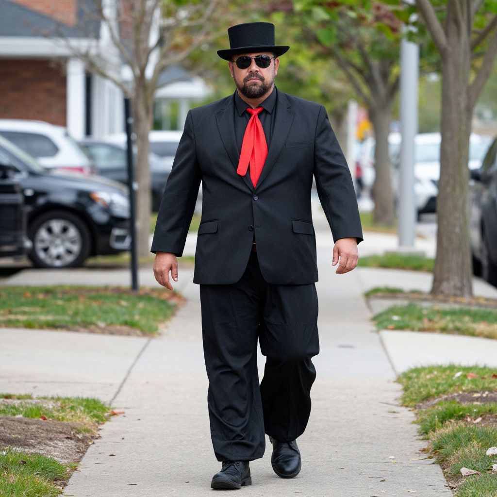 Photograph of a bearded man with a trimmed beard, wearing a black suit, black hat, and black sunglasses, paired with a bright red necktie. He walks confidently down a suburban sidewalk, bordered by grass and trees with scattered autumn leaves. The background includes parked cars and a brick building. His black shoes are polished, and the image has a slightly overexposed, vibrant quality. The man's attire and accessories create a striking contrast against the more subdued suburban setting.