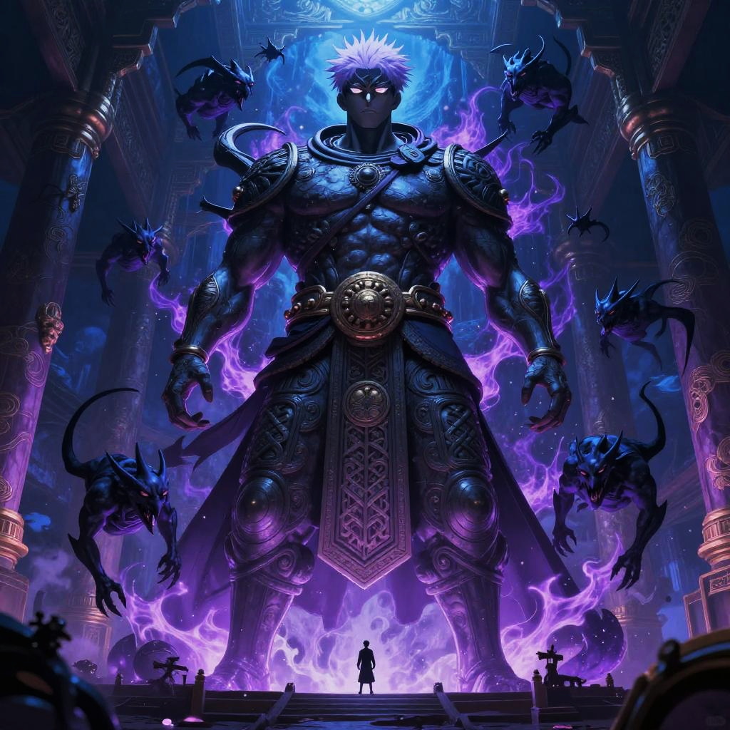 Jujutsu Kaisen generator, concept art of a massive ancient cursed relic with intricate carvings, radiating a dangerous, pulsating energy field with animated cursed energy particles and shadow beasts emerging, set in an eerie temple with blue and purple hues, rich detail.