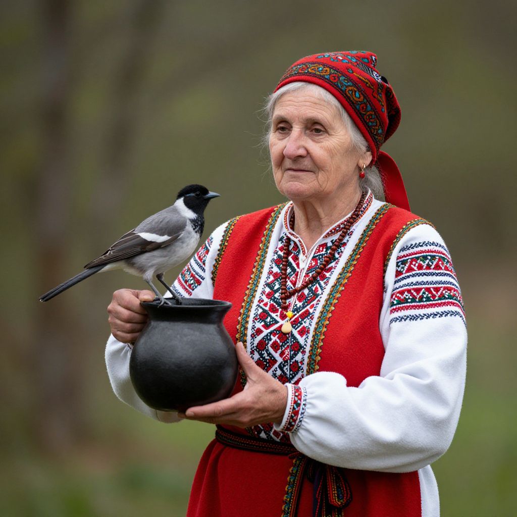 Photograph of an elderly woman in traditional Eastern European folk attire, holding a black pot with a black-and-white bird perched on it, set against