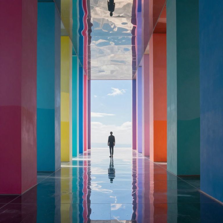 A solitary figure stands at the end of a surreal, brightly colored architectural corridor with high glossy columns in multi-colored hues. The floor and ceiling reflect the sky and the person, creating a dreamlike atmosphere where water-like reflections blend with vivid colors and open sky beyond.