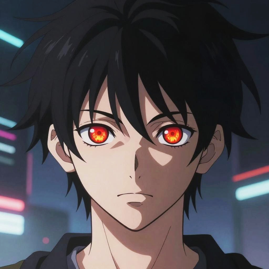 Eyes anime boy staring intensely, fiery red eyes glowing, sharp features, wind-swept black hair, dramatic lighting, futuristic cityscape background, high contrast anime art