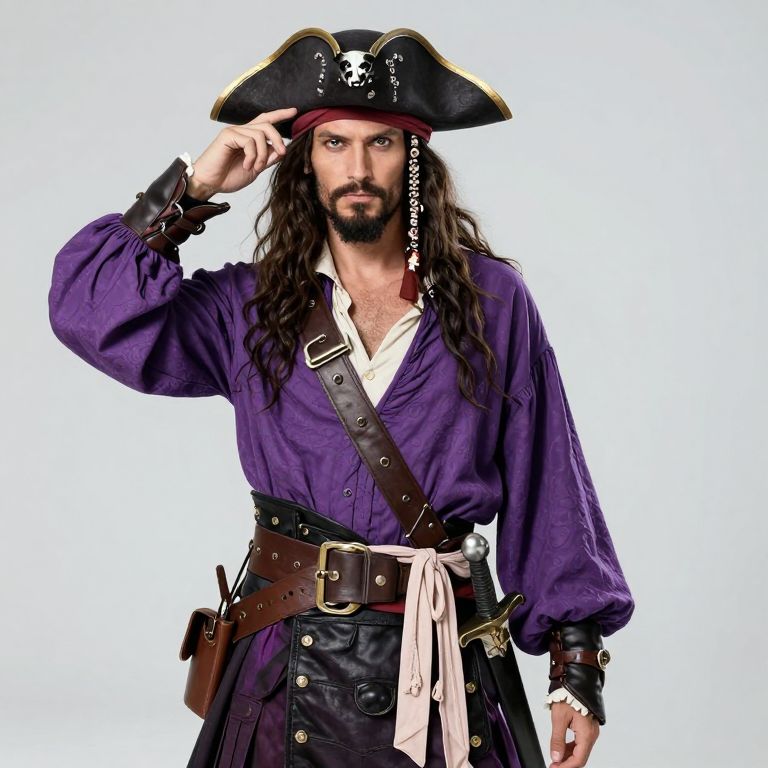 Purple Pirate Outfit, pirate in purple shirt and hat with long hair and a sword