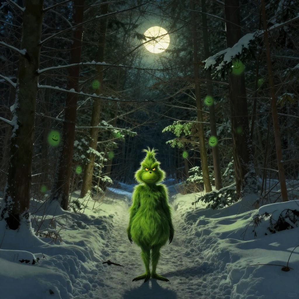 A winter forest path illuminated by soft moonlight with a Grinch filter effect overlaying the scene, giving the trees a whimsical green glow, the snow a slight green tint, and subtle grinning shapes hidden among the shadows for a mysterious festive vibe.