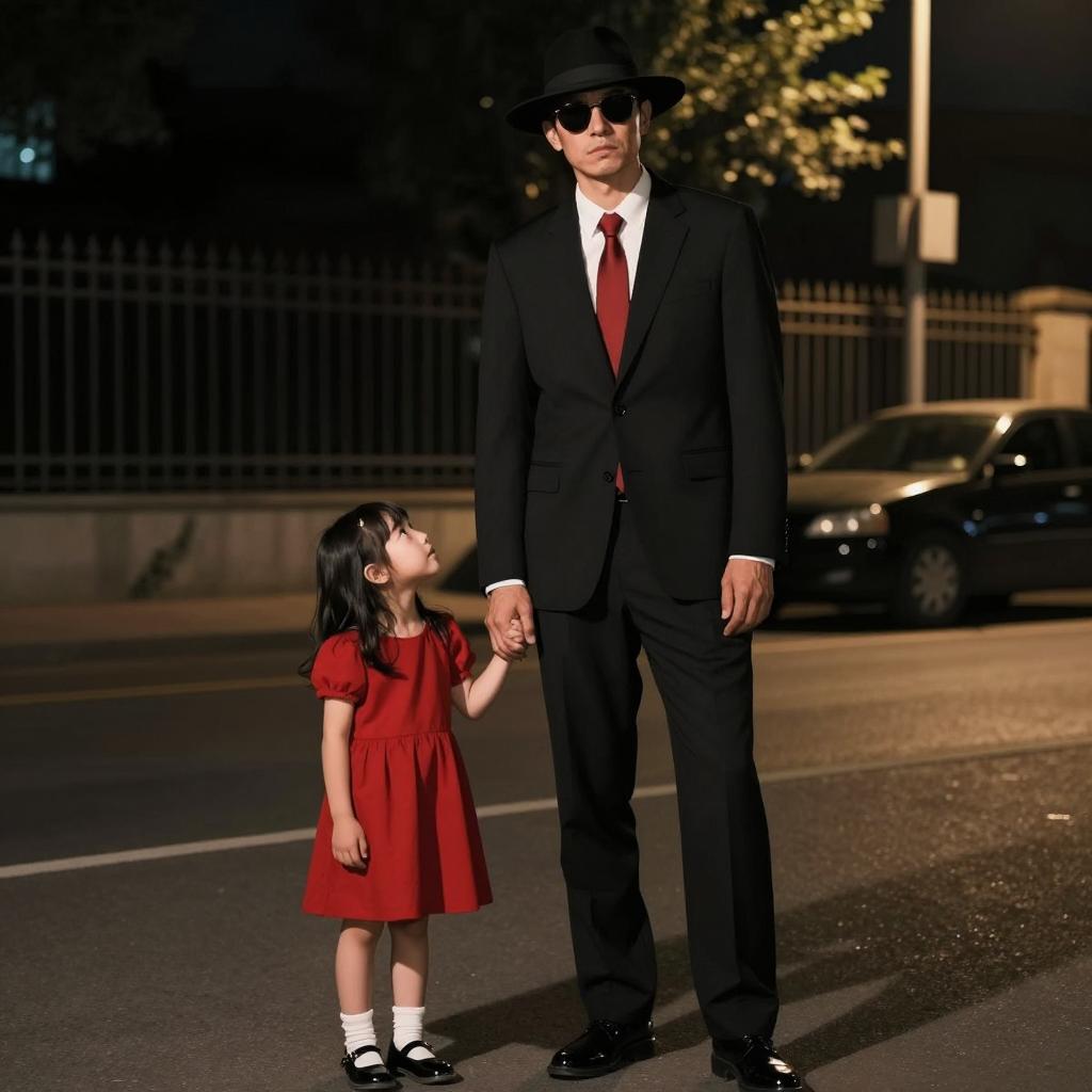 Man in black suit, white shirt, red tie, black hat, sunglasses, holding hand of young girl in red dress, white socks, black shoes. Dark night, street, iron fence, parked car, streetlights. Man tall, serious expression, girl small, looking up.
