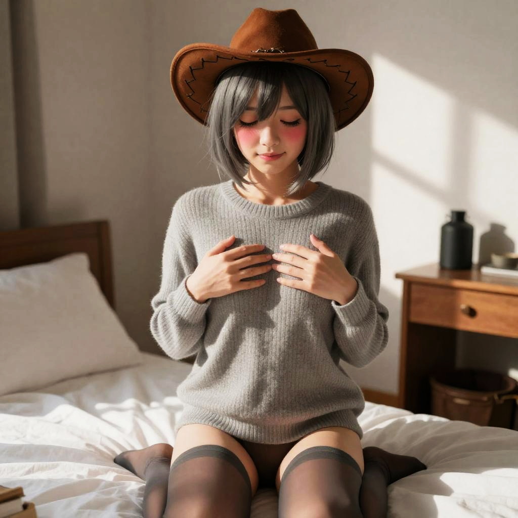 (masterpiece:1.2), best quality, absurdres, illustration, 8k, realistic shadows, volumetric lighting, (cute:1.1), ambient lighting, colorful, cowboy shot, blush, beautiful detailed shadows, light rays, skindentation, long eyelashes, ultra-realistic, realistic, incidence of light, cinematic lighting, hdr, upper body, light smileindoors, bedroom, bed, deskUzaki_Yanagi, 1girl, breasts, solo, short hair, grey hair, ribbed sweater, bare legs, long bangs, hair over eyes, no pants, sweater only, thighhighs, hands on breasts