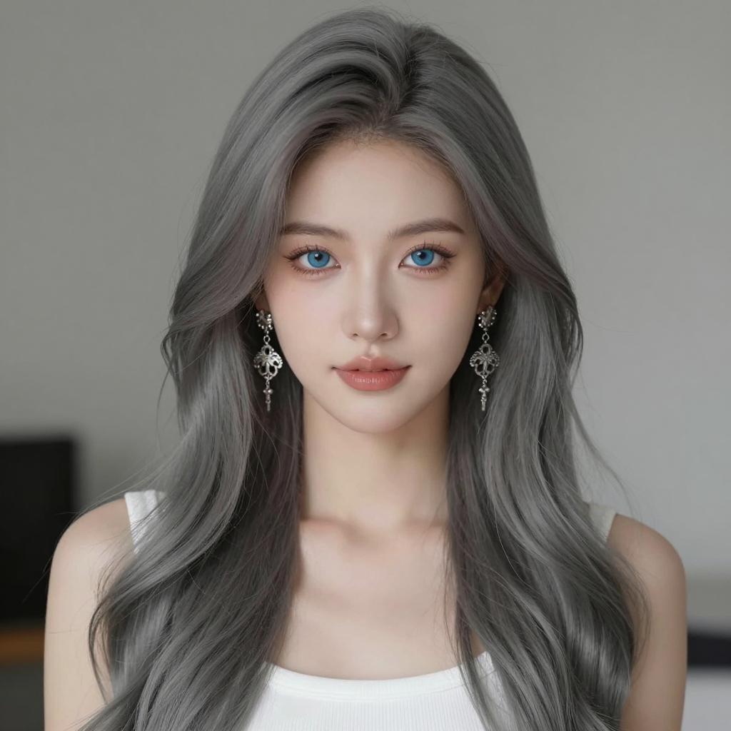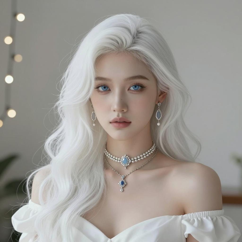 Wavy blue wig hair, digital portrait of a young woman with long wavy blue and purple hair, off-shoulder blue dress, detailed blue and gold jewelry, blue gemstone earrings and necklace, fair skin, blue eyes, soft makeup, ornate golden and blue background, fantasy style, realistic, detailed hair ure, elegant and regal, high-quality, hyper-realistic, anime-inspired, front view, centered, luxurious and intricate design