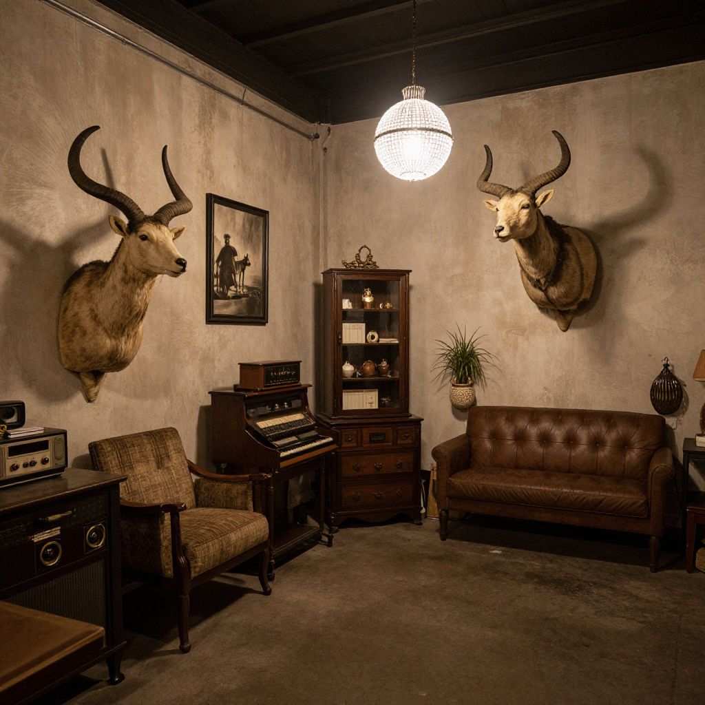 A beautifully curated interior showcases a harmonious blend of industrial and vintage aesthetics, featuring striking taxidermy deer heads mounted on dark walls, complemented by warm, golden-hour lighting and eclectic decor including shelves filled with antiques, framed artwork, and potted plants, all rendered in a high-definition, realistic style that captures the essence of a sophisticated boutique or gallery space.