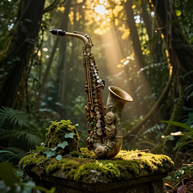 Gransax, an ancient saxophone carved from stone and wrapped in ivy, resting on a mossy altar deep within a hidden temple, illuminated by shafts of golden sunlight piercing through the dense jungle canopy, illustrating a sacred musical artifact.