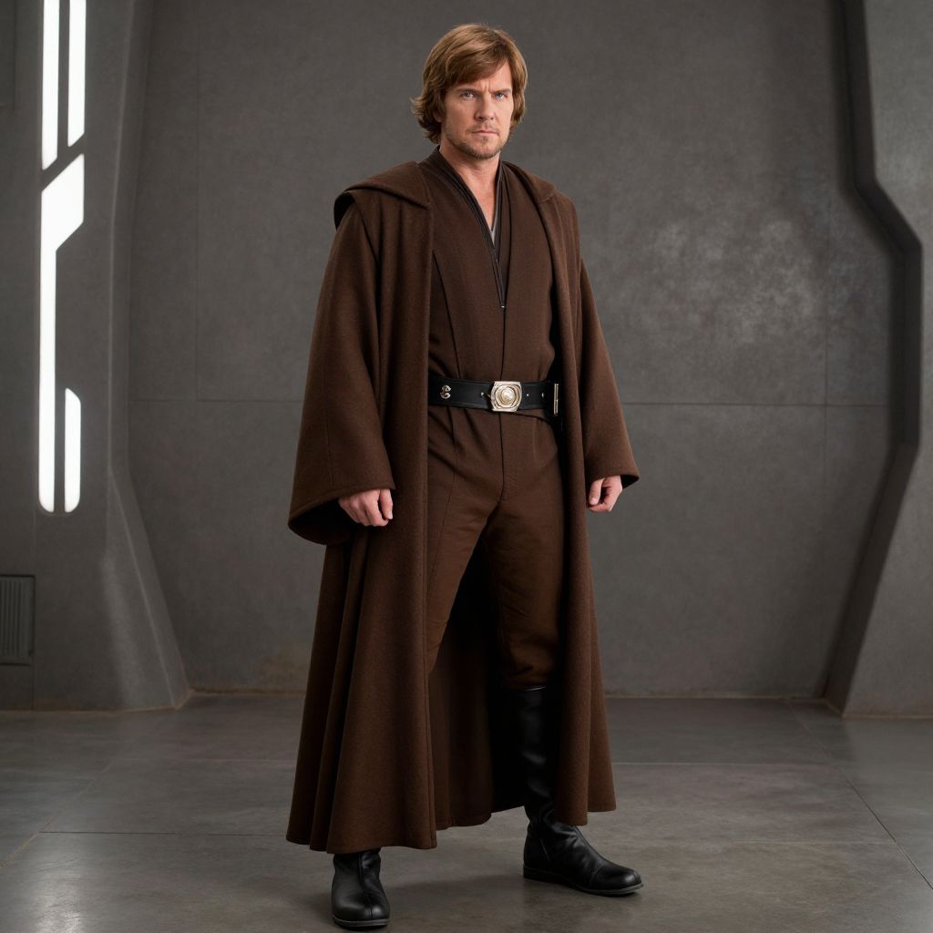 Photograph of a man with brown hair wearing a long brown Jedi robe, black belt with silver buckle, black boots, standing in a gray, futuristic