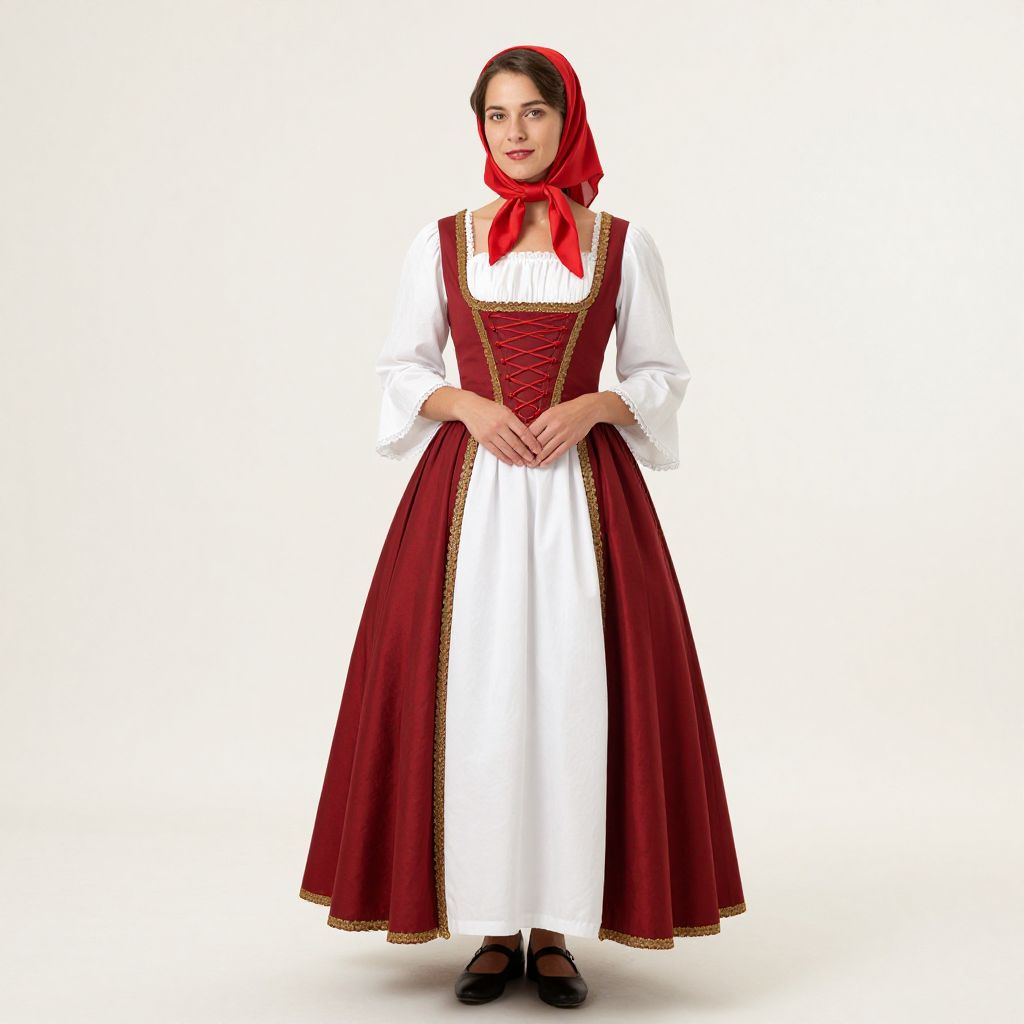 Renaissance Faire Woman Costume, woman in a red and white dress and a red head scarf