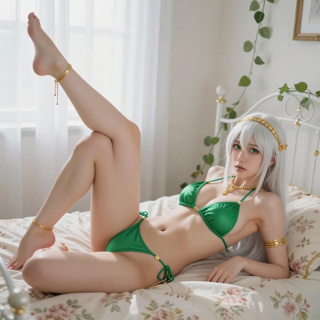Digital artwork of a white-haired anime girl with green eyes, wearing a translucent green dress and gold accessories, lying on a floral-patterned bed. She raises one leg, revealing her bare thigh and buttocks. The background features a white metal bed frame, ivy-covered brick wall, and bright sunlight filtering through white curtains.